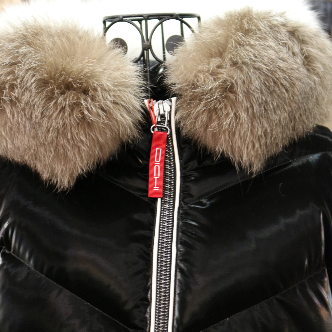 Abrigo acolchado Dichi con acabado brillante y capucha con pelo extraíble. Cálido, elegante y muy favorecedor para el invierno.