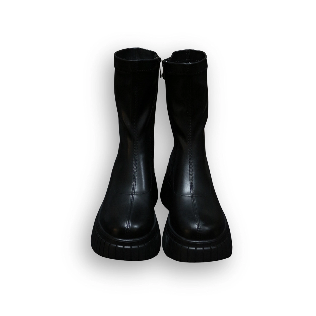 Bota de caña media fabricada en acabado negro uniforme, con una plataforma robusta que aporta altura y estilo sin renunciar a la comodidad. Diseño minimalista y líneas rectas que estilizan la pierna, cierre lateral para un ajuste práctico y un aire contemporáneo ideal para combinar con cualquier outfit urbano.