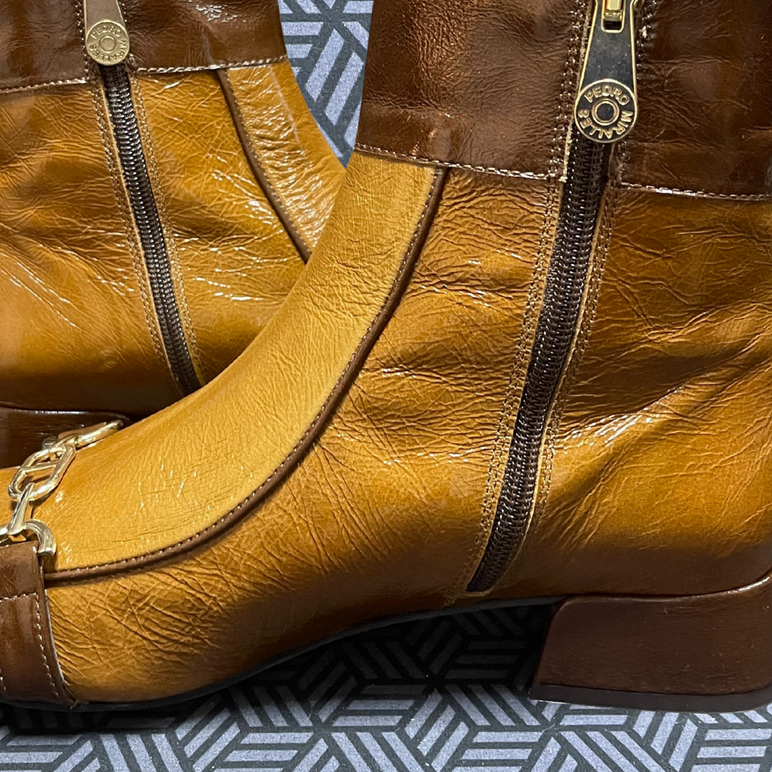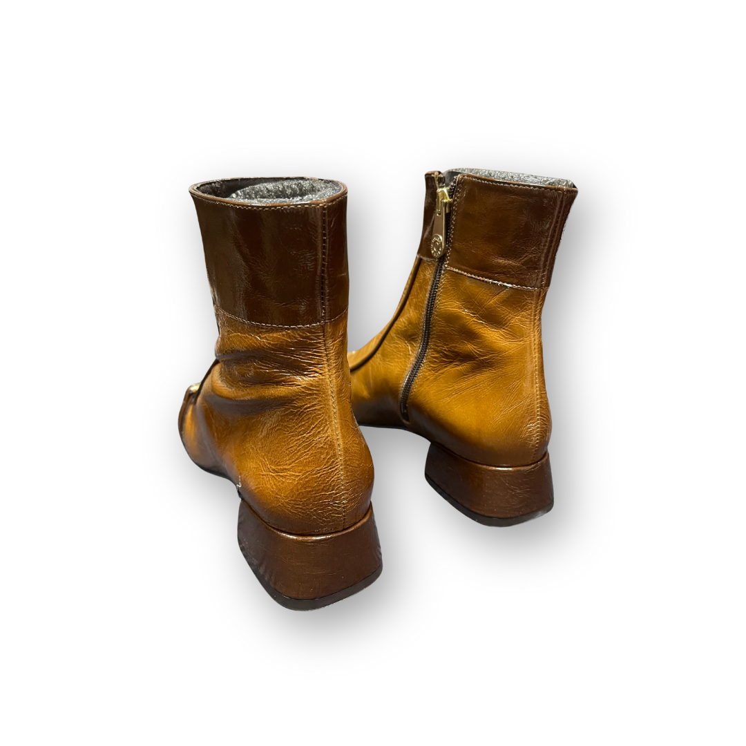 Botín confeccionado en piel con acabado brillante, diseño de caña media y cierre lateral con cremallera para un calce cómodo. Incorpora adorno metálico en el empeine que aporta un toque sofisticado y actual. Tacón medio estable y suela resistente, pensado para combinar estilo y comodidad en el uso diario o en ocasiones más especiales.