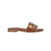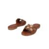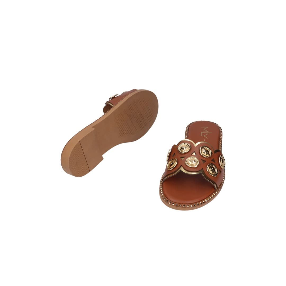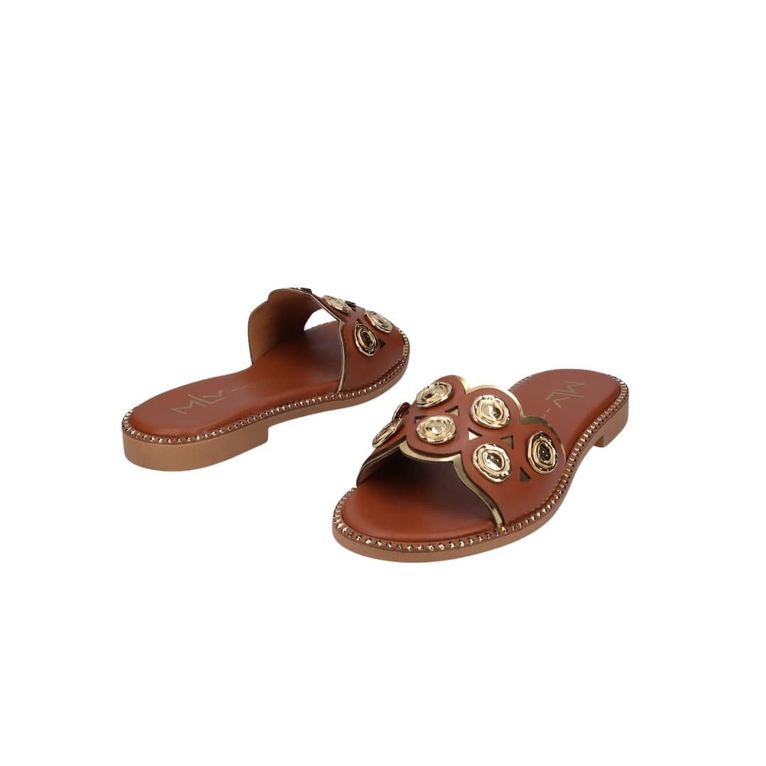 Sandalia MLV Chris, cómoda y elegante con detalles dorados en marrón y negro.