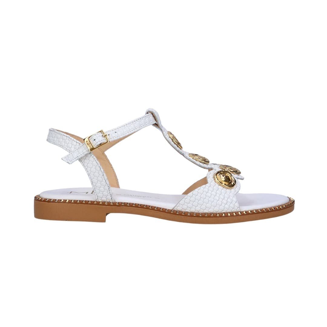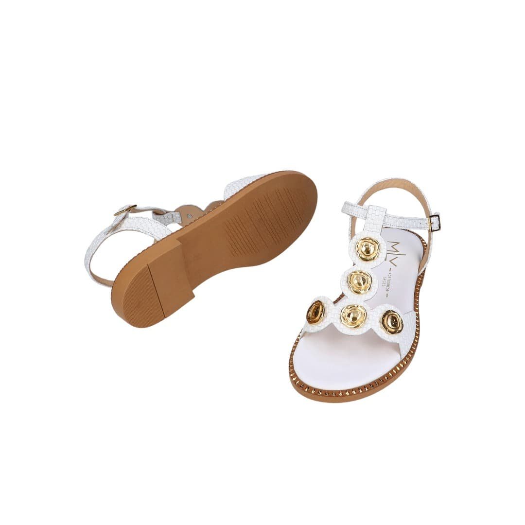 El diseño incorpora una tira central con detalles metálicos en dorado que añaden personalidad y un acabado cuidado. La pulsera trasera con cierre ajustable garantiza una sujeción cómoda, mientras que la suela plana con detalles decorativos ofrece ligereza y confort en cada paso.