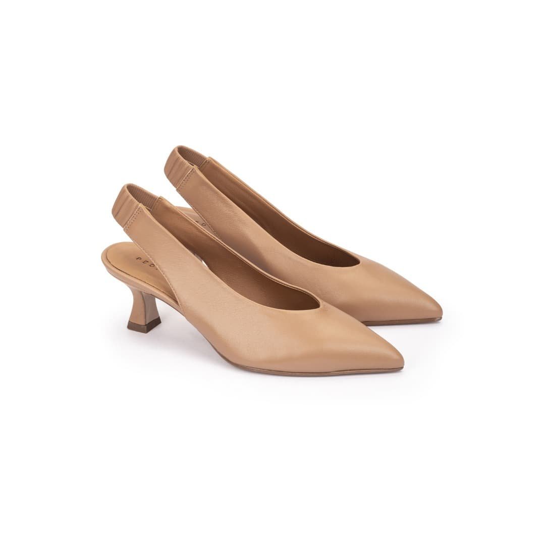 El diseño cerrado en la parte delantera estiliza el pie, mientras que la tira trasera elástica proporciona una sujeción cómoda y adaptable. El tacón medio aporta altura sin renunciar a la estabilidad, ofreciendo una pisada confortable durante todo el día.